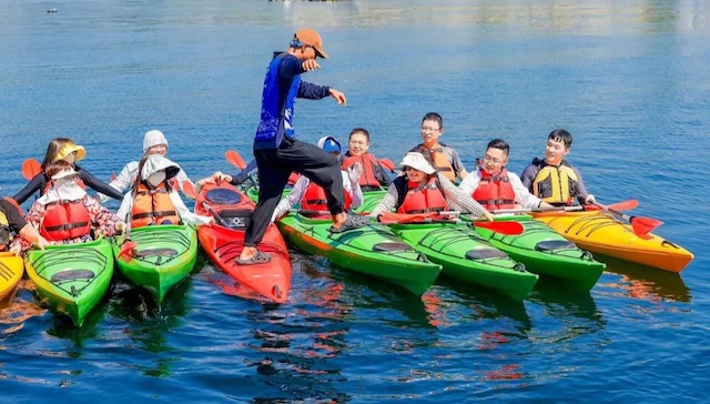 第二种方案是桨板瑜伽加团队拼板,适合10到30人,风格更偏向放松和拍照。上午进行桨板基础教学,大家可以在板上练习站立和划行,自由拍照。下午挑战“多人同划一块超大桨板”或者用多个小桨板拼出公司LOGO的形状。结束后岸边准备热姜茶和淋浴更衣房,非常贴心。