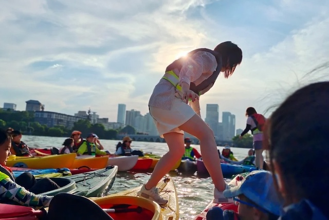 第一种方案是皮划艇竞速加“水上钢琴”挑战,适合20到60人的团队。活动分为单人艇和双人艇两种,先进行分组接力赛,掉进水里的环节往往最欢乐也最能拉近距离。然后进行“水上钢琴”挑战——一个人依次从排列好的艇头走过,其余队友在旁边扶稳艇身,非常考验平衡和信任。全程有持证教练和救生员,每人配备高浮力救生衣,零基础的人半小时就能学会基本划桨技术。